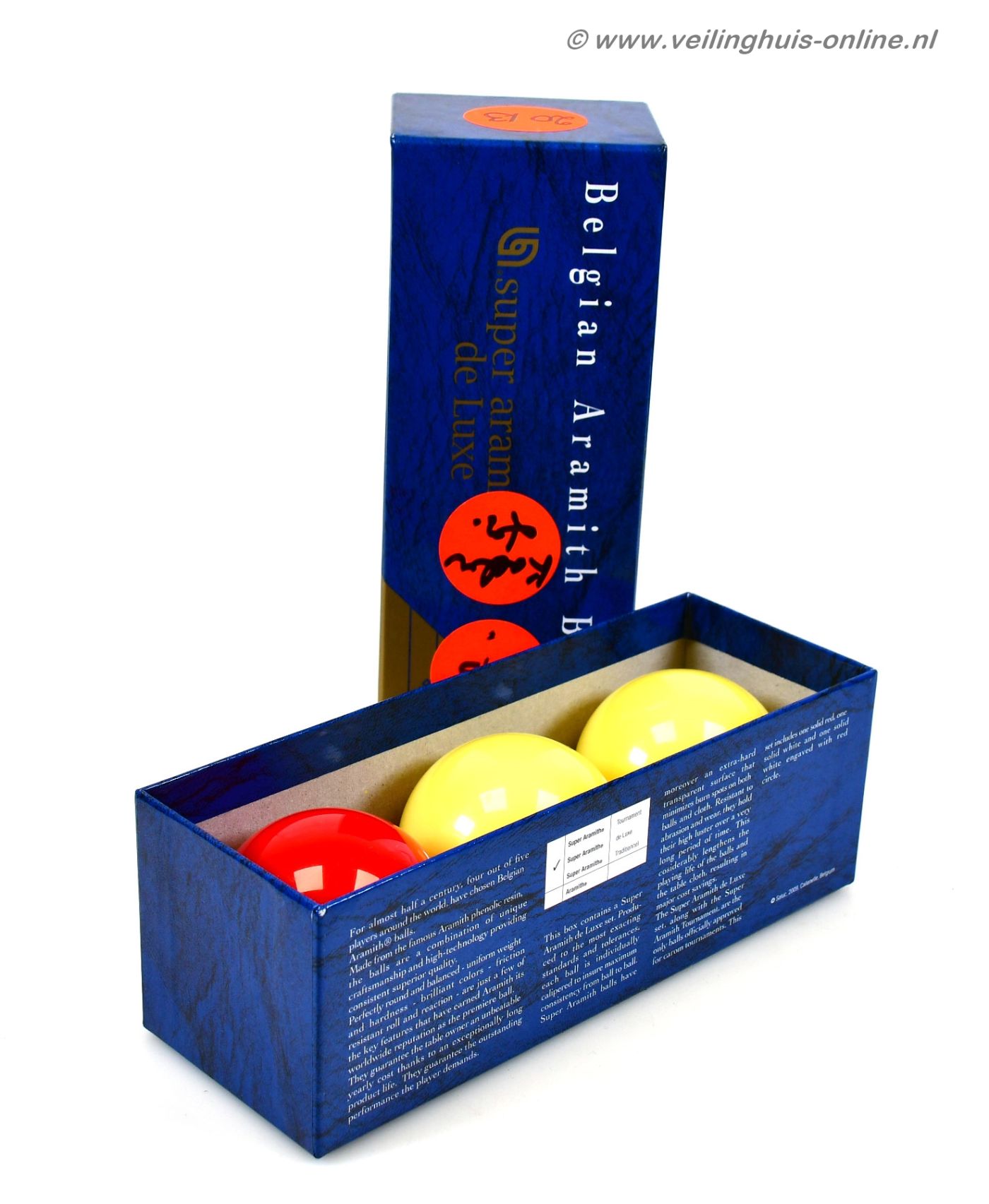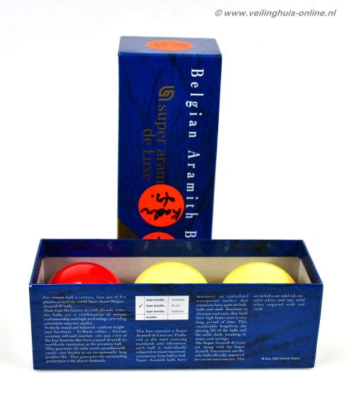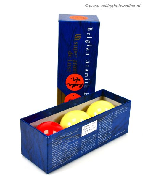| Bijzonderheden | In de originele doos De Super Aramith-set is gemaakt van geavanceerde fenolhars, met een zwaartepunt dat een perfect ware en nauwkeurige rol garandeert, met de afmeting 61,5 mm. |