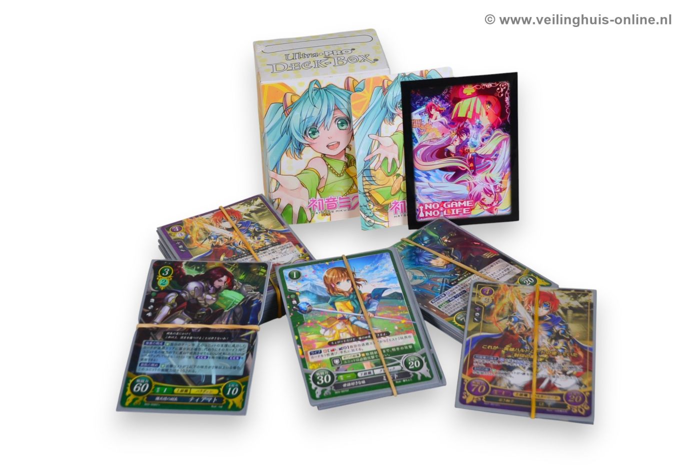 | Bijzonderheden | De waarde van Crypton Hatsune Miku ruilkaarten kan sterk variëren. De waarde hangt af van meerdere factoren, waaronder de zeldzaamheid van de specifieke kaart, de staat waarin de kaart verkeert en het kaartspel waar de kaart deel van uitmaakt, zoals Weiss Schwarz of een andere verzamelreeks De doos is van Hatsune Miku De kaarthoesjes zijn van de No Game No Life series De kaarten zijn van het spel Fire Emblem: Cipher |