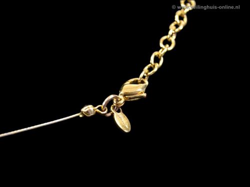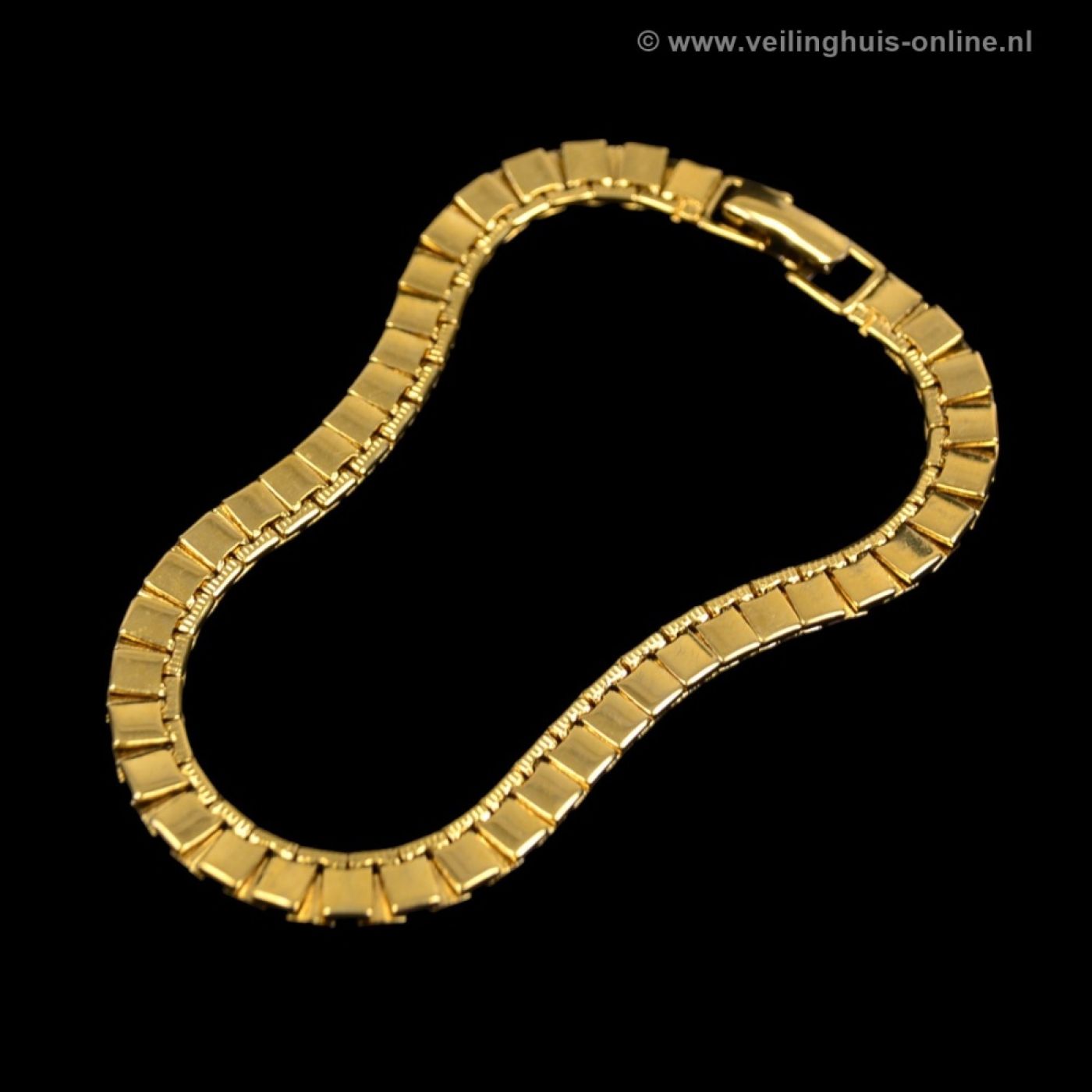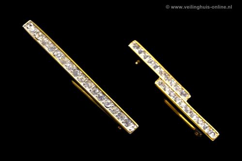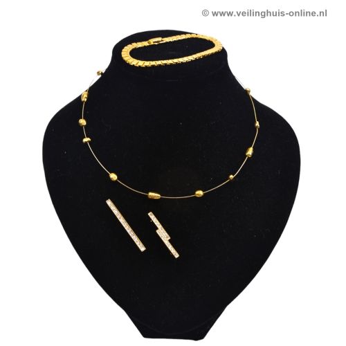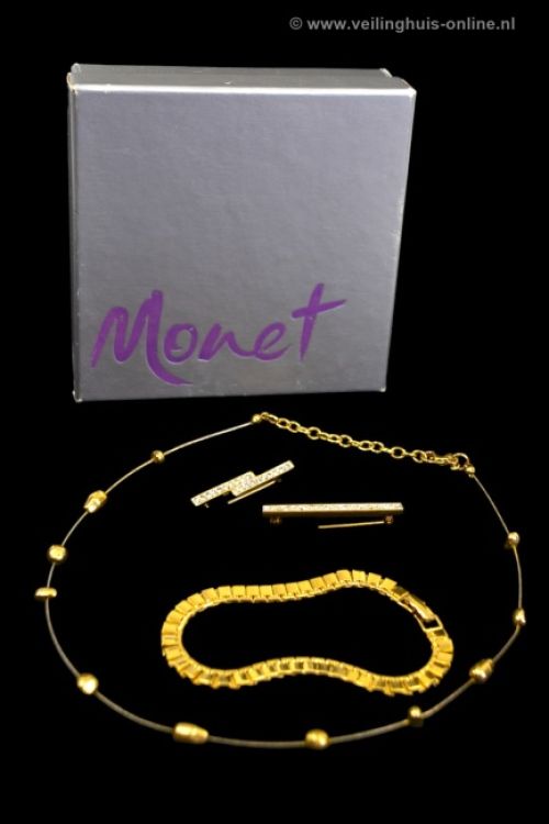 | Bijzonderheden | Collier : Draadmodel met vergulde vaste onregelmatige kralen - Lengte 43 cm incl. verstelbaar kettinkje Armand : Platte schakel - Lengte 18 cm 2x Broche met Swarovski kristallen - Lengte 3,5 en 4 cm Incl. originele verpakking |