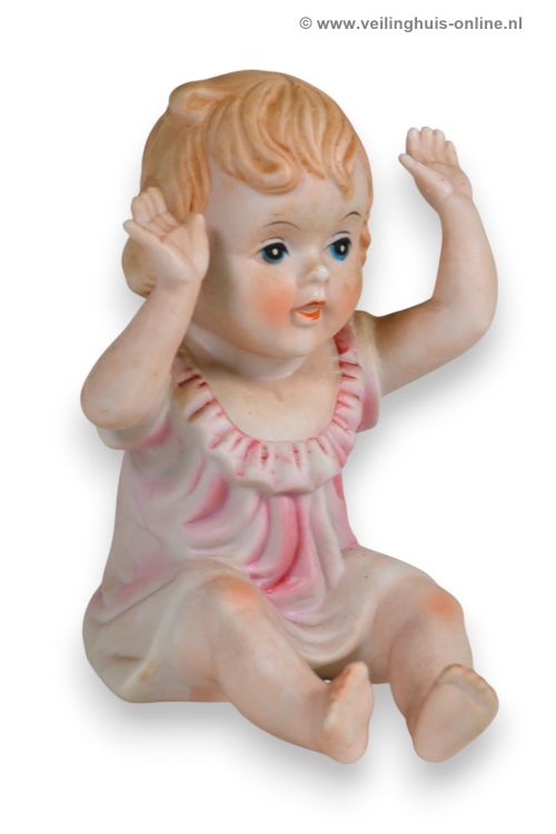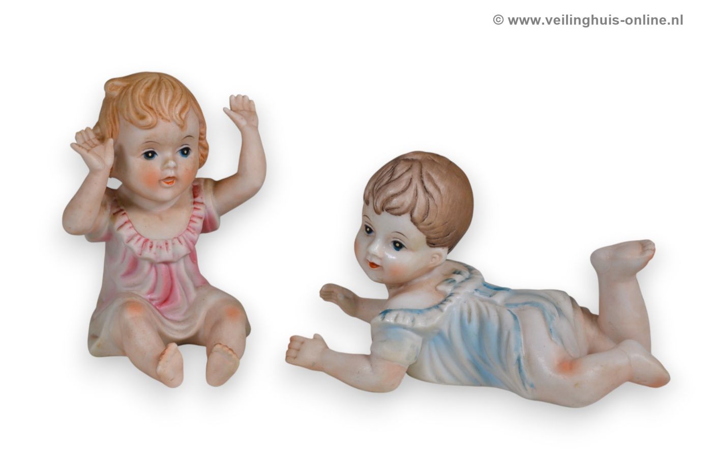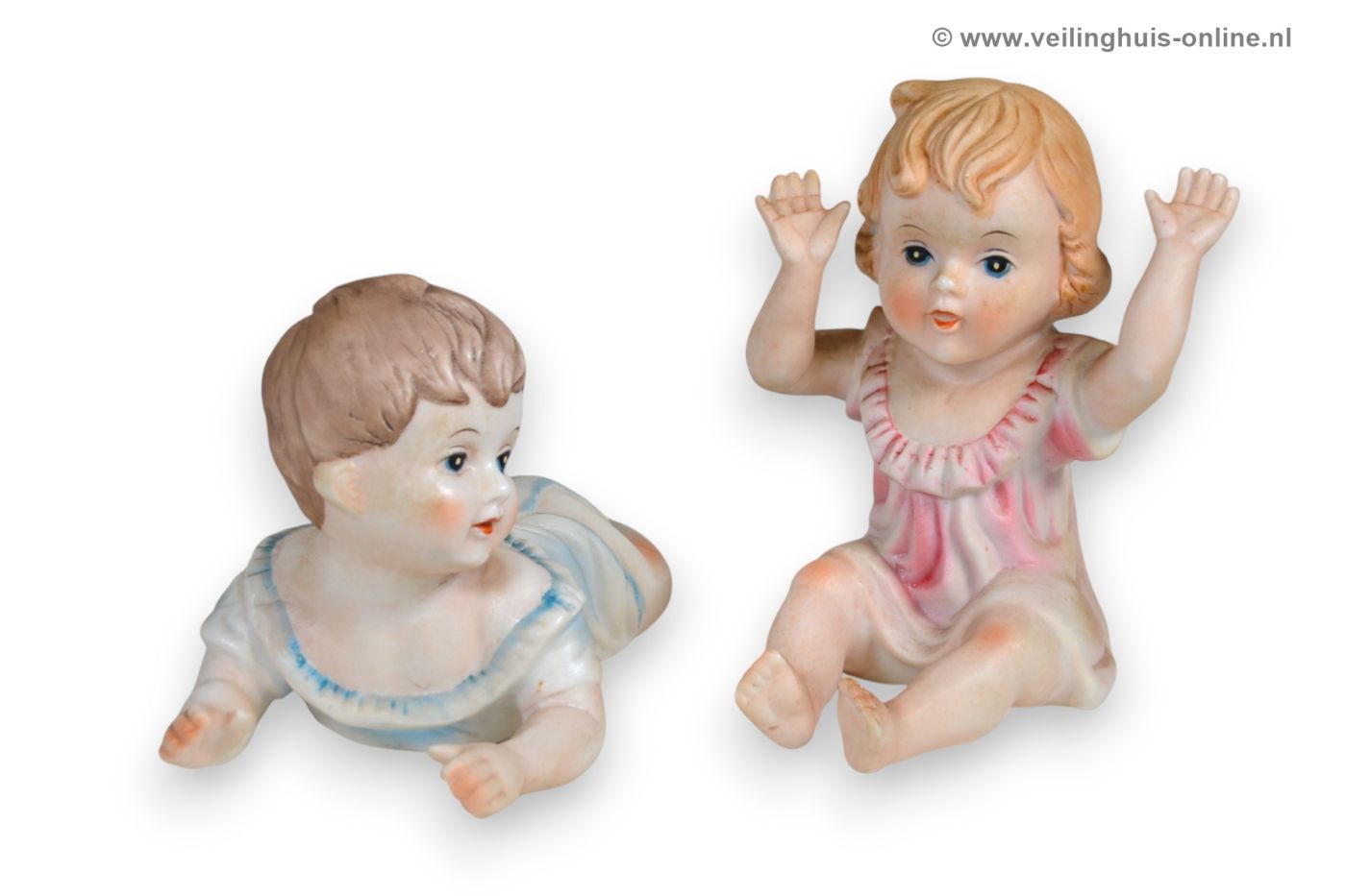 | Bijzonderheden | 2 Vintage "Piano Baby's" Porseleinen beeldjes Liggend jongetje 16 x 8 x 9 cm Zittend meisje 10 x 7 x 11,5 cm |